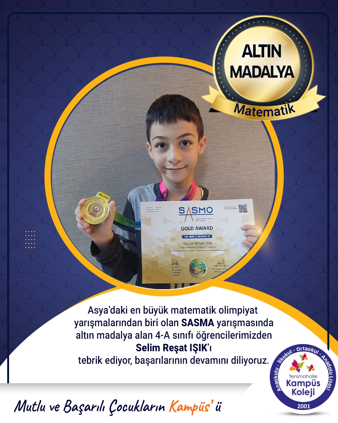 Asya’daki en büyük matematik olimpiyat yarışmalarından biri olan SASMA yarışmasında altın madalya alan 4-A sınıfı öğrencilerimizden Selim Reşat IŞIK’ı tebrik ediyor, başarılarının devamını diliyoruz.